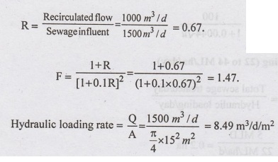 6. AHRTF of 15 m ϕ operated with primary effluent of 1500 m3/d, recirculated effluent flow 1000 m3/d. Calculate recirculation factor and hydraulic loading rate on filter.