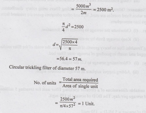 Design suitable dimensions of a circular trickling filter unit for treating 5 million litres of sewage per day. The BOD of sewage is 150 mg/l.