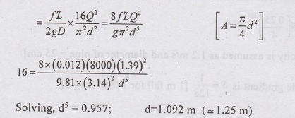 Q = 1.39 m3/s, L = 8 km = 8000 m, HL = 16m